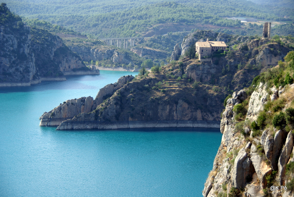 ← derrière la ligne de crêtes des Pyrénées, l’Espagne en contrebande (du côté de Huesca), le sanctuaire de l’Opus Dei (Torreciudad)