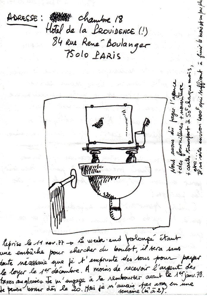 Le week-end prolongé étant une embûche pour chercher du boulot, il sera sans doute nécessaire que je t’emprunte des sous pour payer le loyer le 1er décembre. A moins de recevoir l’argent des taxes anglaises (*). Je m’engage à te rembourser avant le 1er janvier 78. Je pense bosser dès le 20. Mais je n’aurais pas assez en une semaine (même à 2).